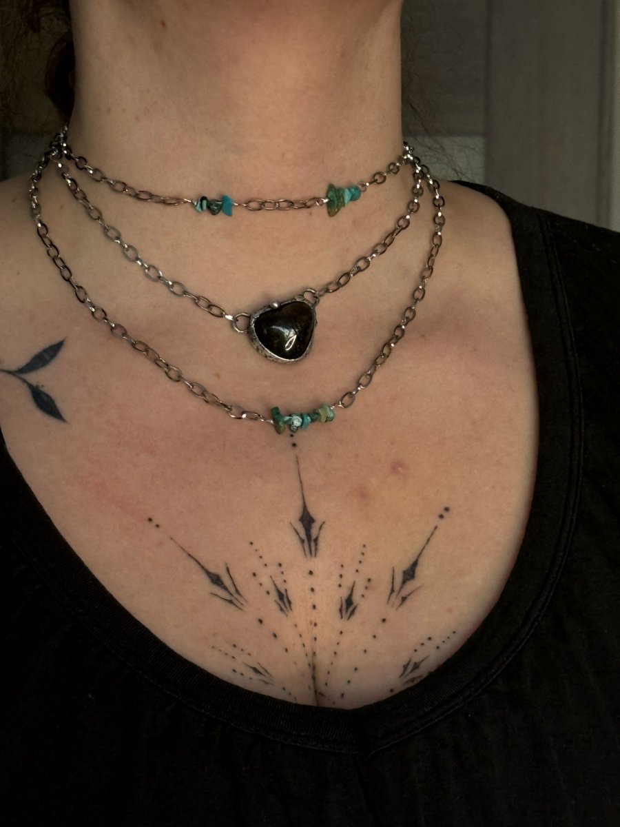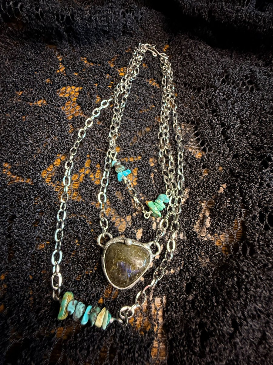 Trojitý náhrdelník z LABRADORITU v kombinaci s drobným tyrkysem, na řetízku z chirurgické oceli. 3 řetízky jsou spojeny do jednoho na zadní straně.