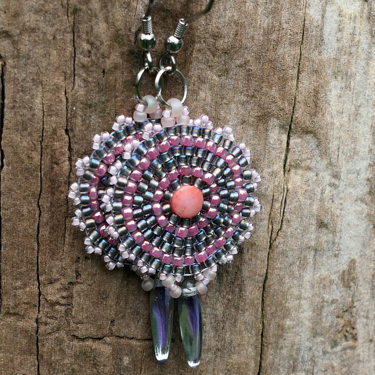 Šité náušničky průměru 2,5 cm, zavěšené na otevřených háčcích z chirurgické oceli. Střed náušniček tvoří placička z růžového korálu.