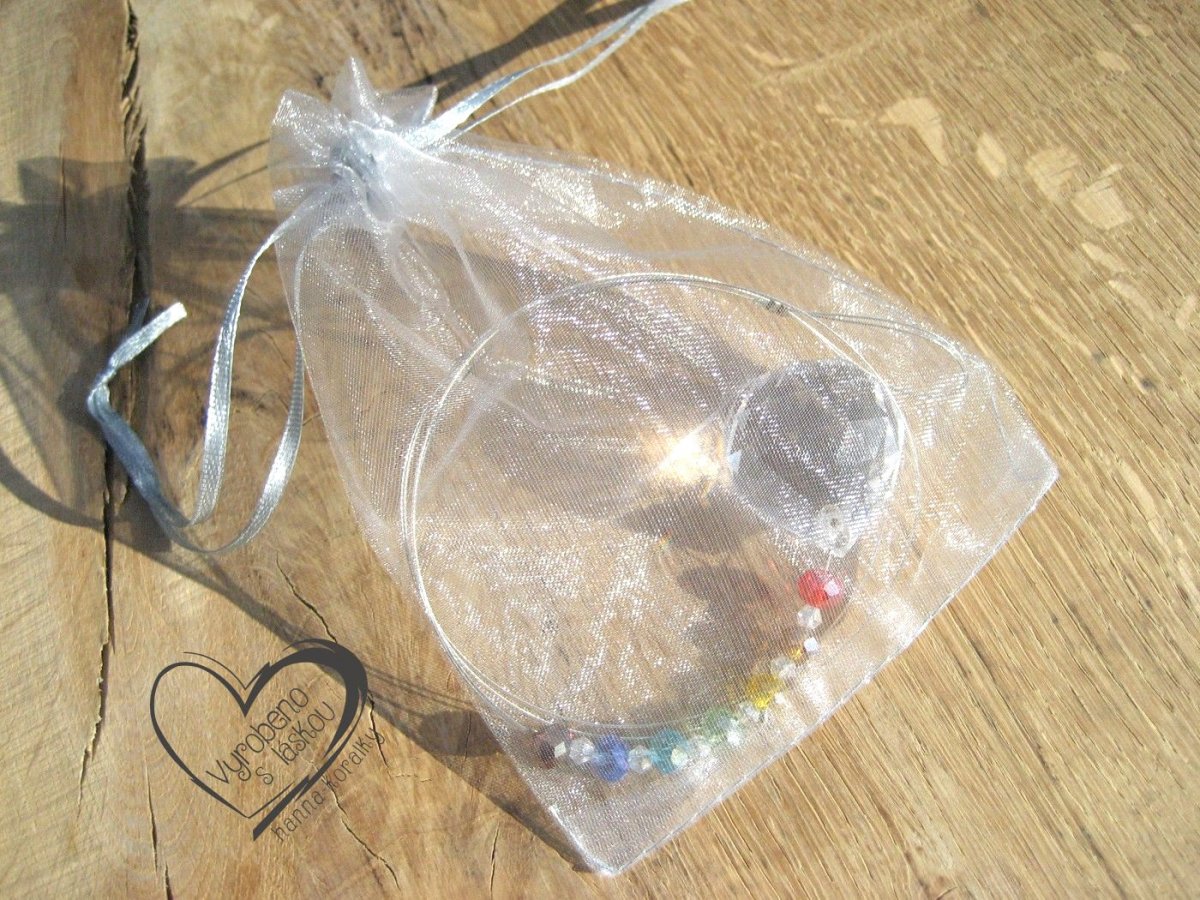 Duhový Feng Shui závěs je vyrobený z broušené koule 2cm a broušených korálků v čakrovém – barevném provedení, vše je zavěšeno na dvojitém, ocelovém lanku s očkem - v délce – 35cm, 55 cm nebo 75cm dle vašeho výběru - do poznámky k objednávce napište požadovanou délku.