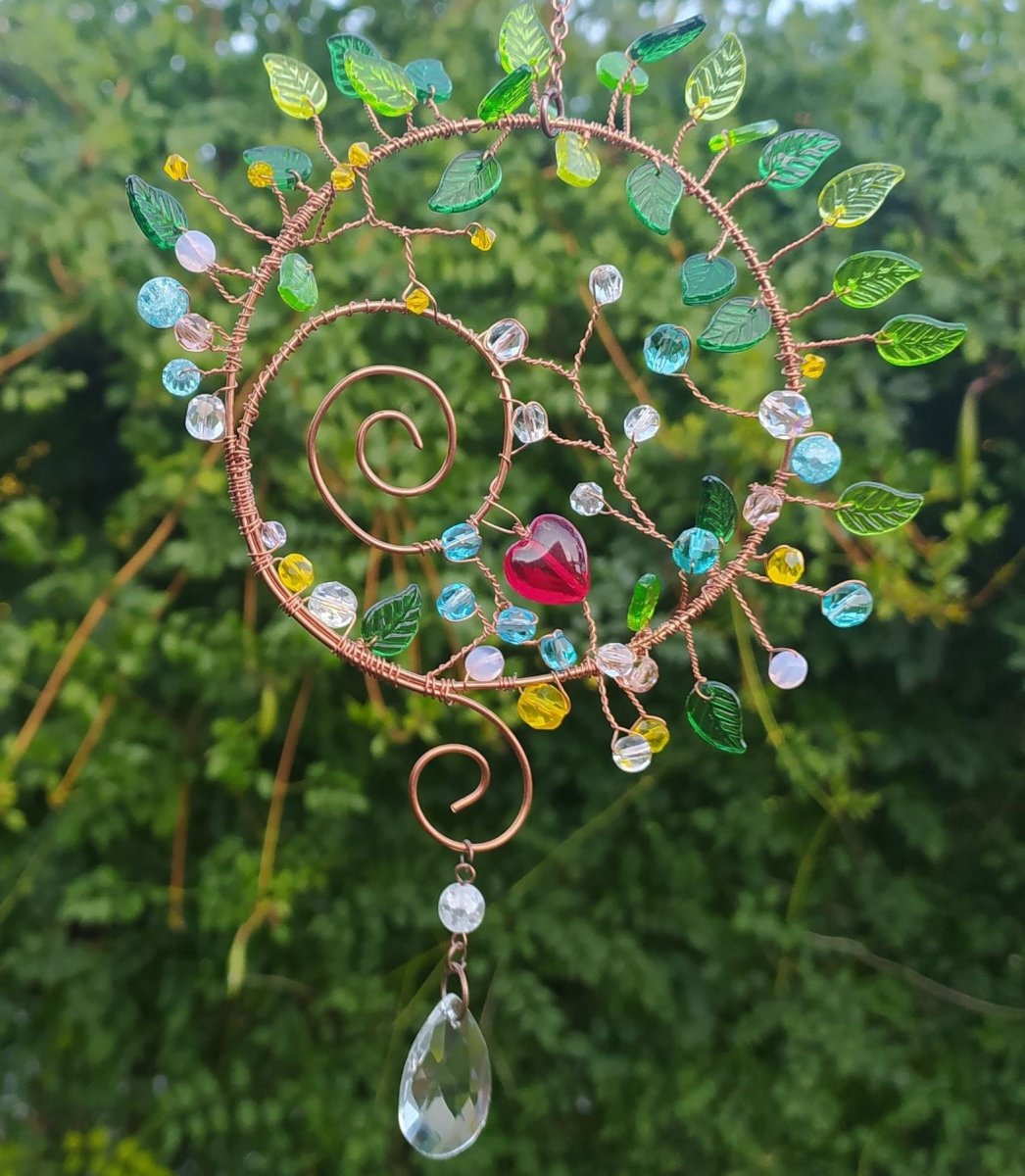 Lapač slunce můžete zavěsit všude tam, kde svítí slunce. Slunce v něm bude světélkovat a přenášet se dál do místnosti. Je vyroben z měděného drátku a skleněných broušených korálků, lístečky jsou z plastu. Dekorace má cca 18 cm + 14 cm řetízek.