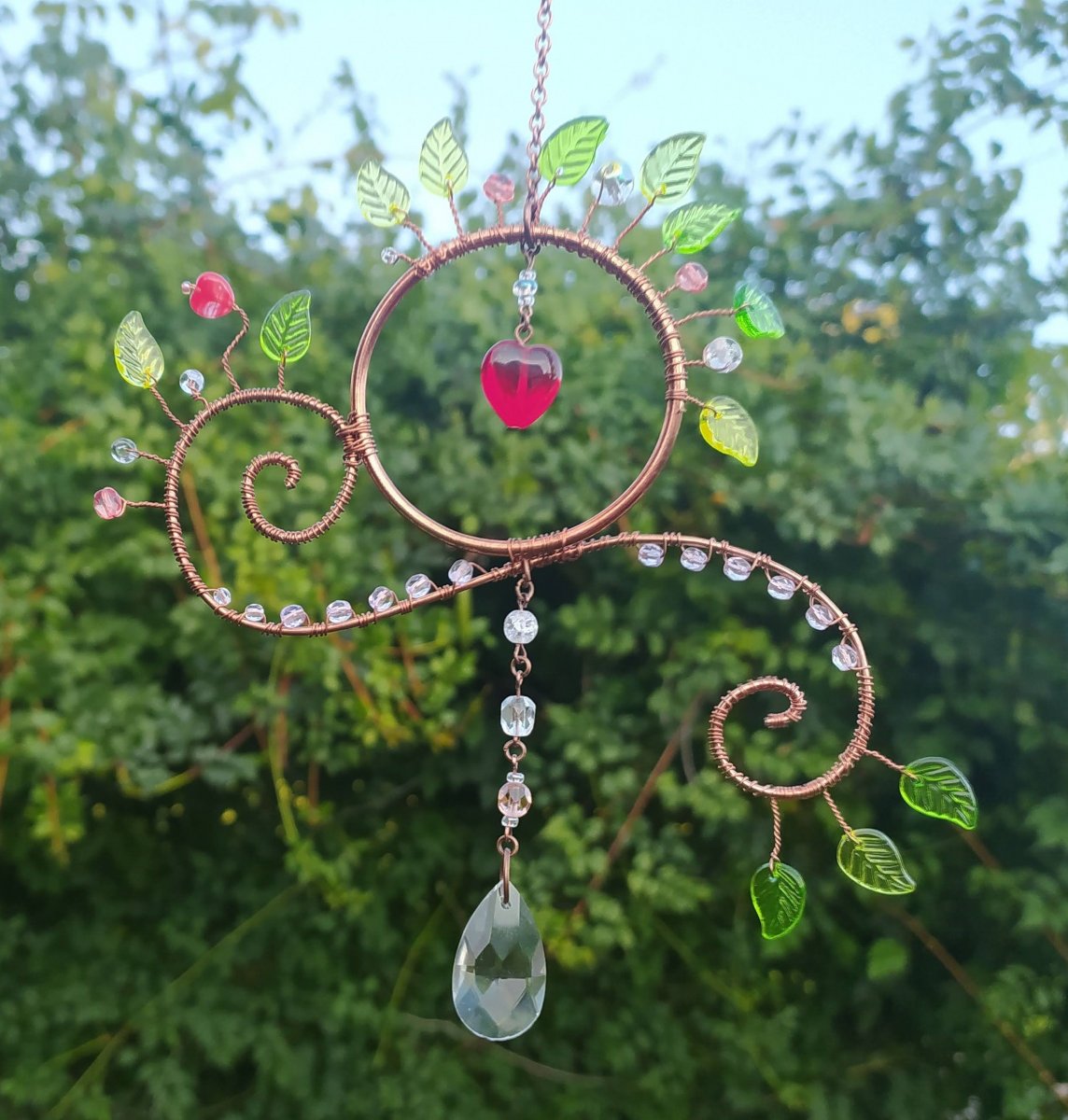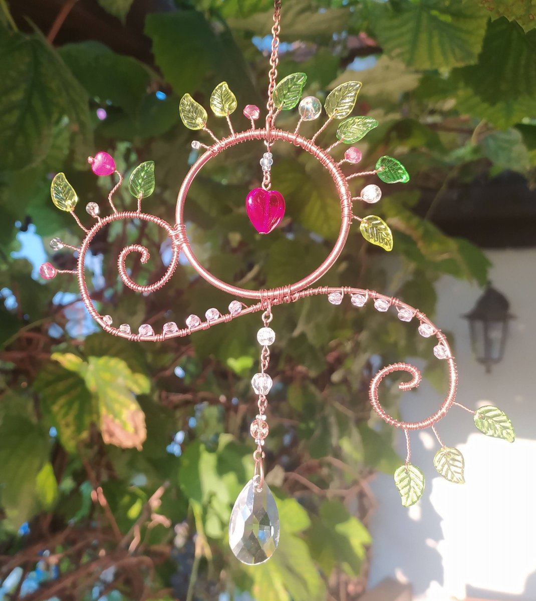 Lapač slunce můžete zavěsit všude tam, kde svítí slunce. Slunce v něm bude světélkovat a přenášet se dál do místnosti. Je vyroben z měděného drátku a skleněných broušených korálků, lístečky jsou z plastu. Dekorace má cca 16 cm + 10 cm řetízek.