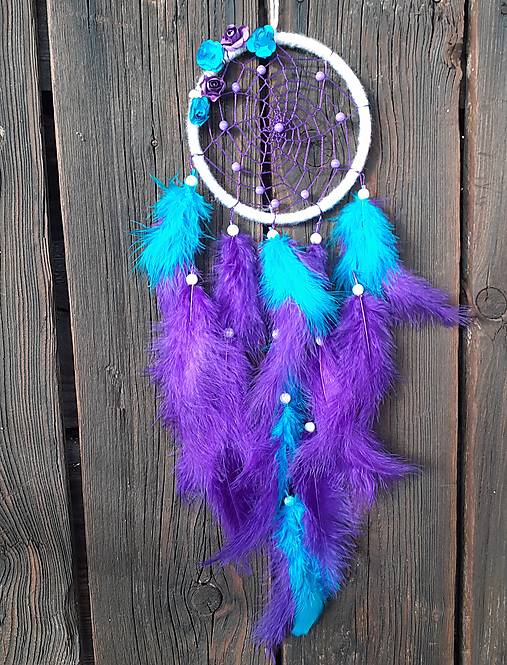 Lapač snov v prevažne fialovej farbe, doplnené aj tyrkysom a bielou. Na okraji zdobia kruh malé ružičky.