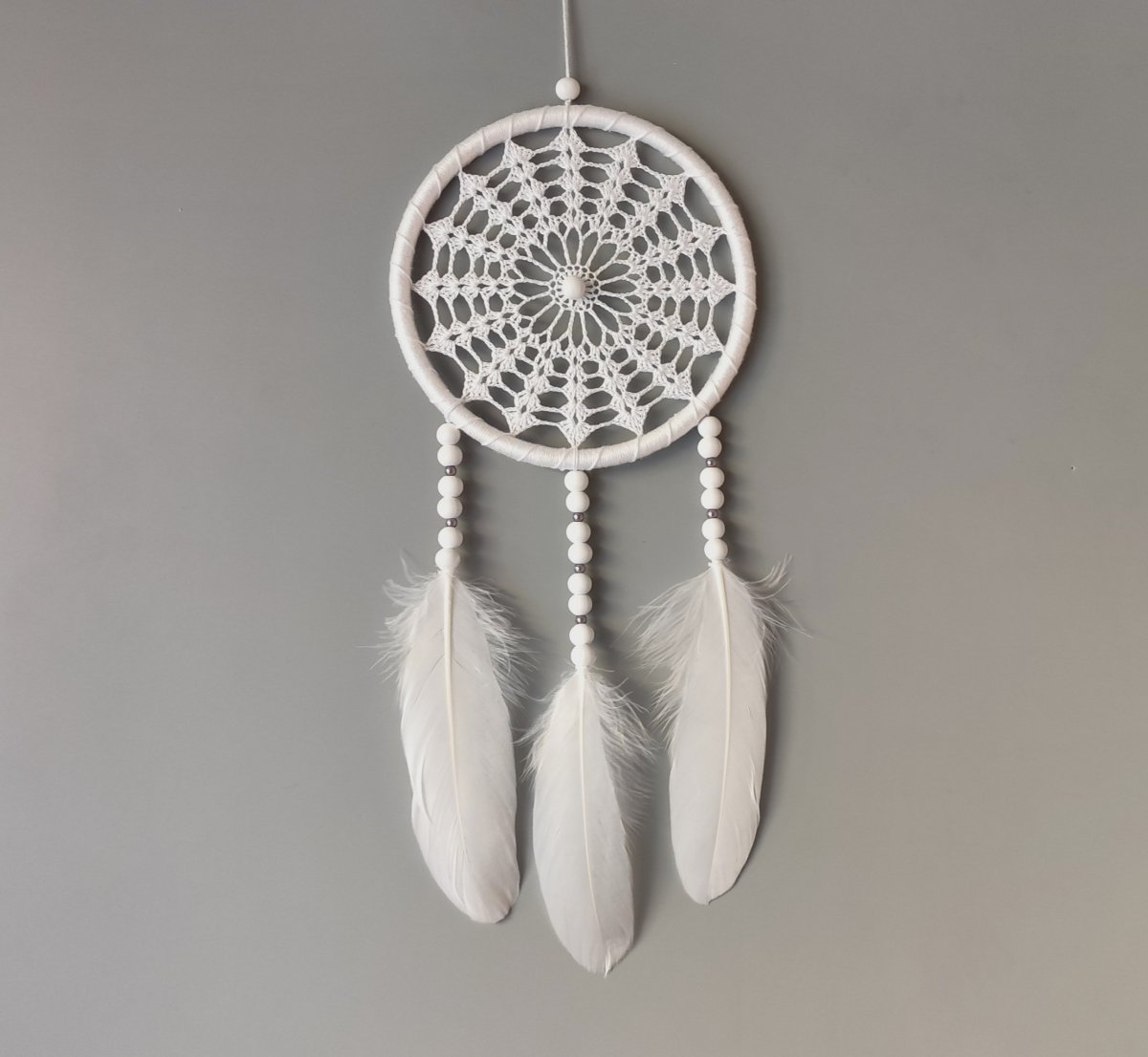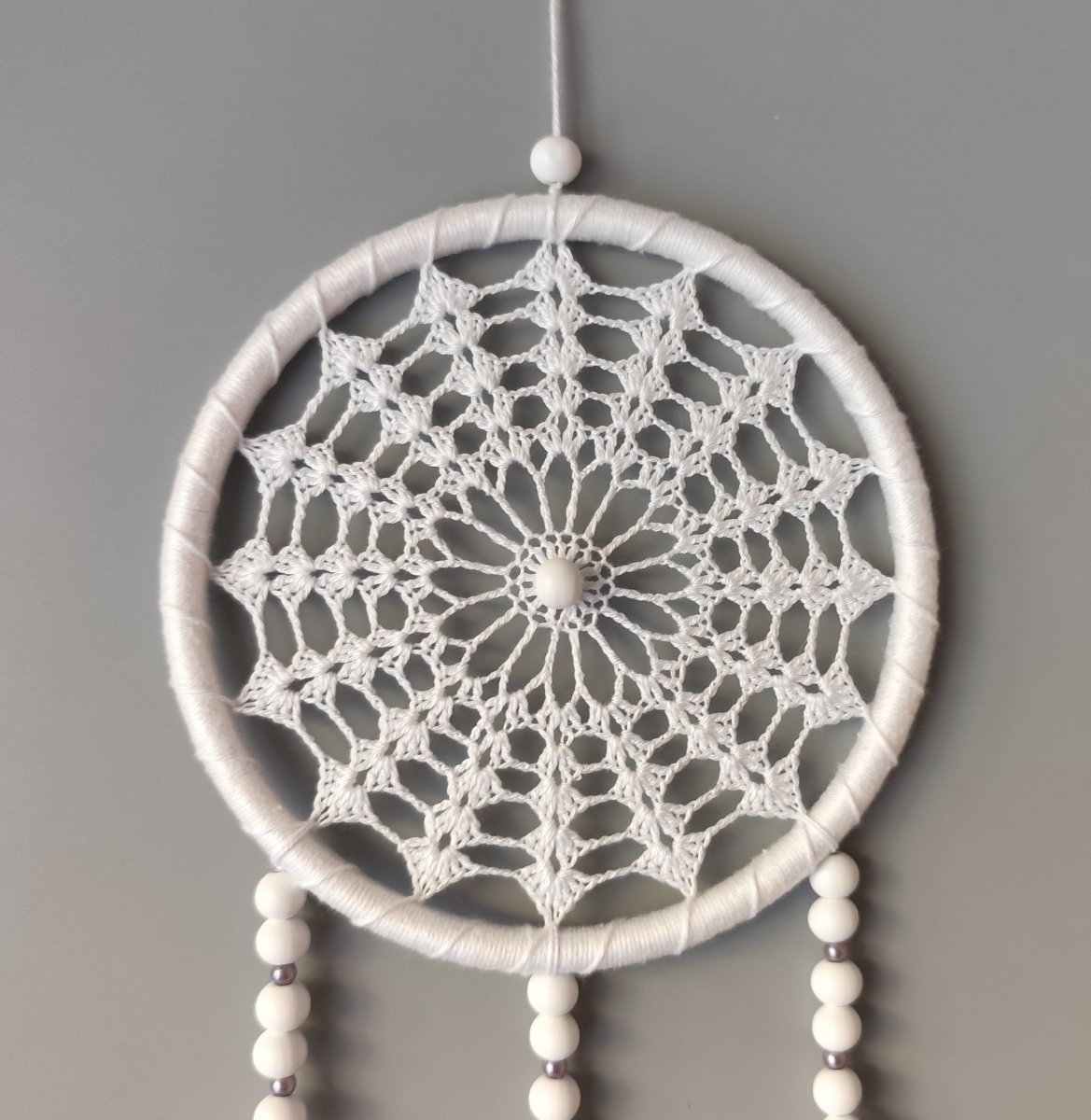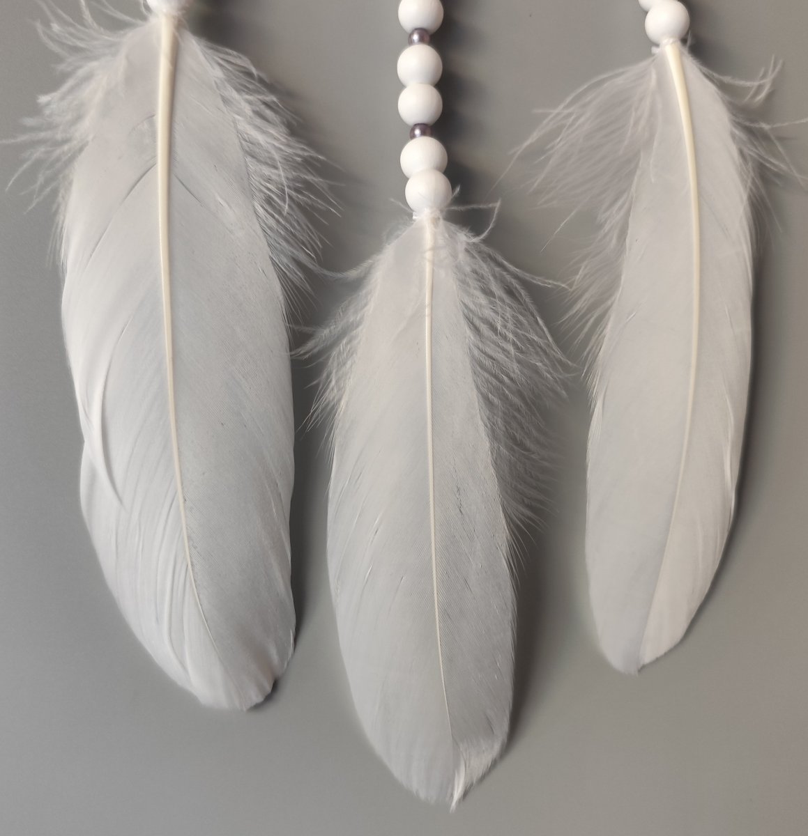 Základní kruh má průměr 15 cm a je omotán bílou 100% bavlnou. Je vyplněn ručně háčkovanou krajkou ze slaboučké 100% bavlny. Na dřevěných a plastových korálcích jsou přichycena tři bílá husí brka.