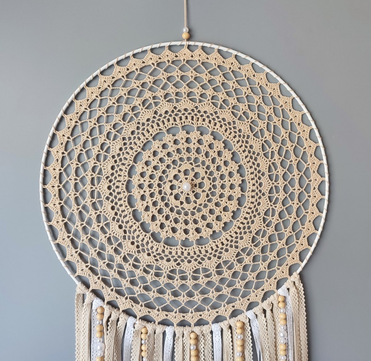 Základní kovový kruh má průměr 40 cm a je vyplněn háčkovanou krajkou z béžové 100% bavlny. Na kruhu jsou zavěšeny béžové a bílé bavlněné krajky a vše doplňují béžová husí peříčka přichycena na dřevěných a plastových korálcích.