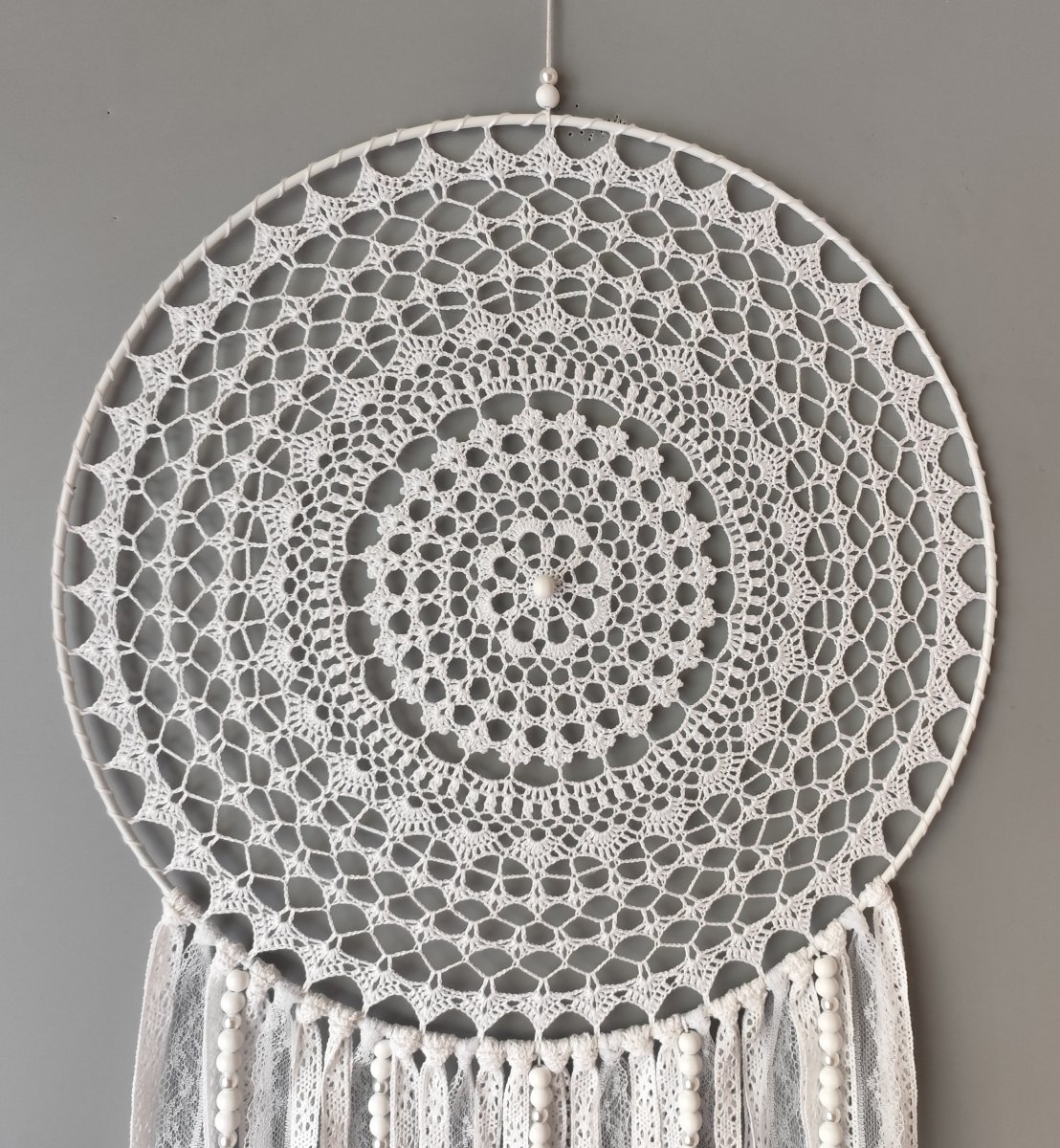 Základní kovový kruh má průměr 40 cm a je vyplněn háčkovanou krajkou z bílé 100% bavlny. Na kruhu jsou zavěšeny bavlněné a silonové krajky a vše doplňují bílá husí peříčka přichycena na dřevěných korálcích a voskových perlách.
