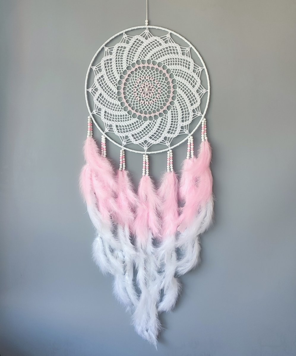 Základní kovový kruh má průměr 35 cm. Je vyplněn háčkovanou krajkou nakombinovanou v bílé a růžové barvě. Tato vnitřní krajka je háčkovaná ze slaboučké 100 % bavlny. Korálky a peří jsou zavěšeny v dvojnásobném množství. Na dřevěných a plastových korálcích je bohatě zavěšeno růžové a bílé pštrosí peří.