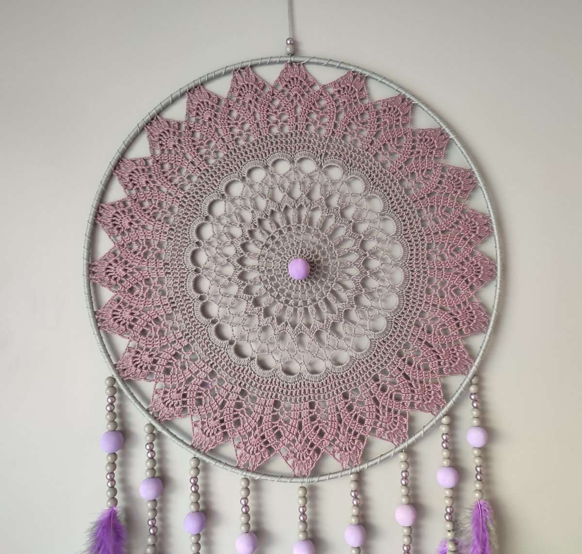 Základní kovový kruh má průměr 40 cm. Je vyplněn ručně háčkovanou krajkou z velmi kvalitní příze 50% bavlna a 50% polyakryl od českého výrobce. Tato příze je postupně stínovaná s dlouhými barevnými přechody a barva postupuje od středu od šedé až fialovou na okraji. Na kruhu je na dřevěných a umělohmotných korálcích zavěšeno fialové a šedé pštrosí peří.