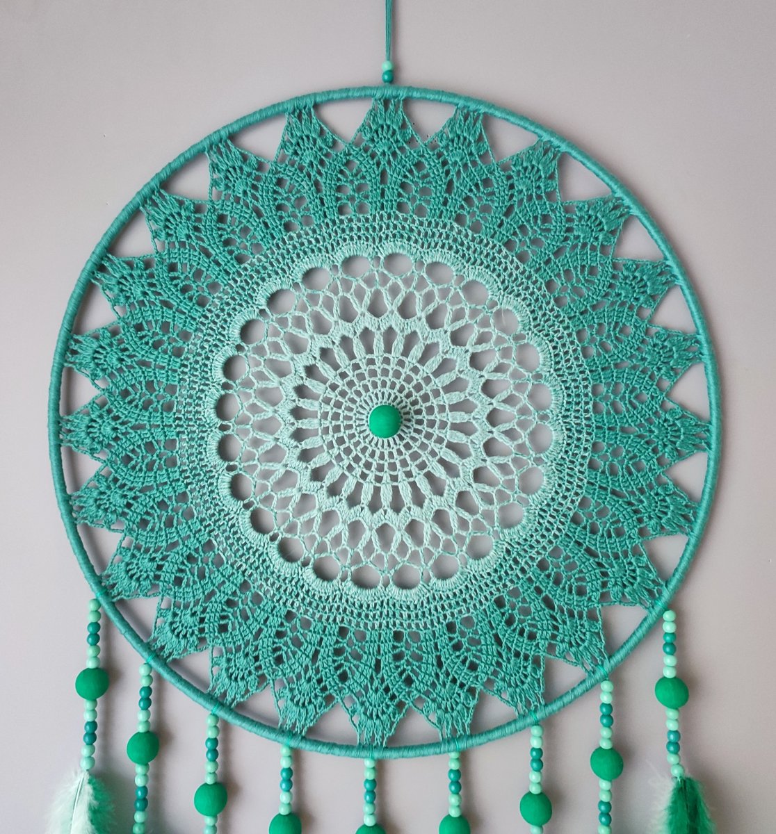Základní kovový kruh má průměr 40 cm a je vyplněn ručně háčkovanou krajkou z velmi kvalitní příze 50% bavlna a 50% polyakryl od českého výrobce. Kruh je omotán stejnou přízí. Tato příze je postupně stínovaná s dlouhými barevnými přechody a barva postupuje od středu od světle zelené až po středně zelenou na okrajích. Na kruhu je na dřevěných korálcích zavěšeno pštrosí peří ve dvou zelených odstínech.
