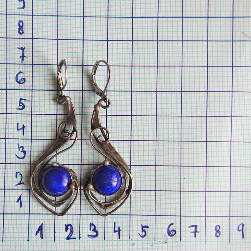 Cínované náušnice s kabošony lapisu lazuli.