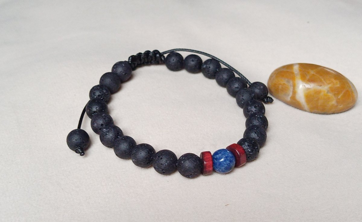 Pánský i dámský shamballa náramek z kuliček o průměru 8 mm černé lávy ozdobený sodalitem mezi mahagonovými dřevěnými korálky. Náramek je navlečený na černé šňůrce s posunuvným macramé zapínáním ukončené lávovými korálky.