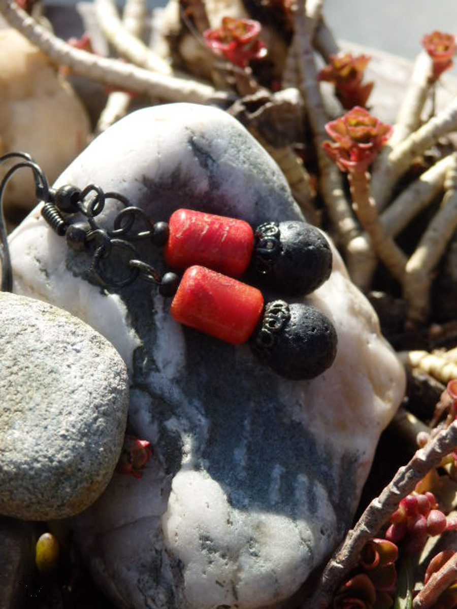 Jemné náušnice z korálu, lávy a kovových komponentů.