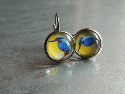 Náušnice s kulatým lůžkem průměru 12 mm, s obrázkem pokrytým skleněnou čočkou. Kovové komponenty z nerezové oceli - antialergenní. Náušnicový háček uzavíratelný.