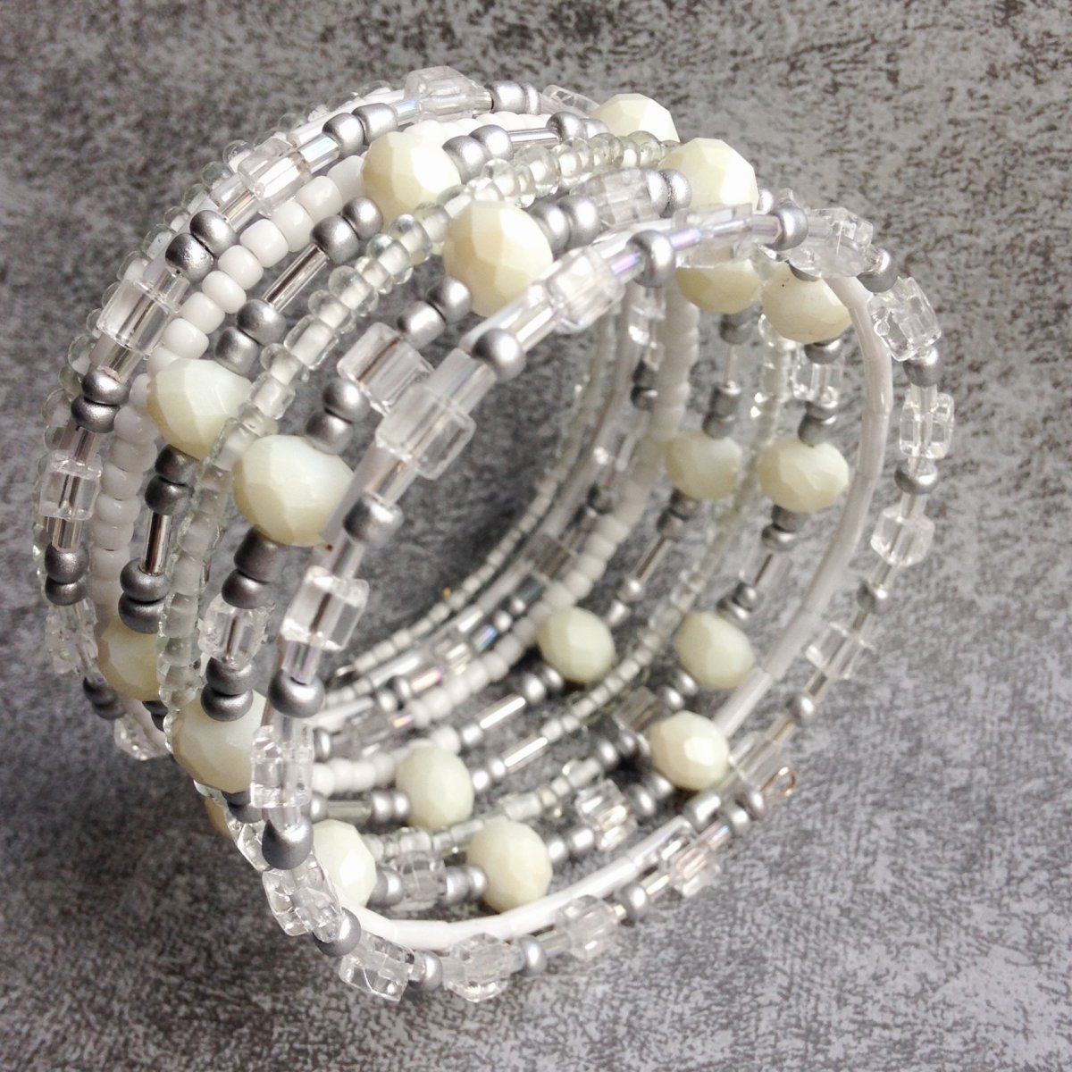 Náramek z paměťového drátu, rokajlu a skleněných broušených korálků.