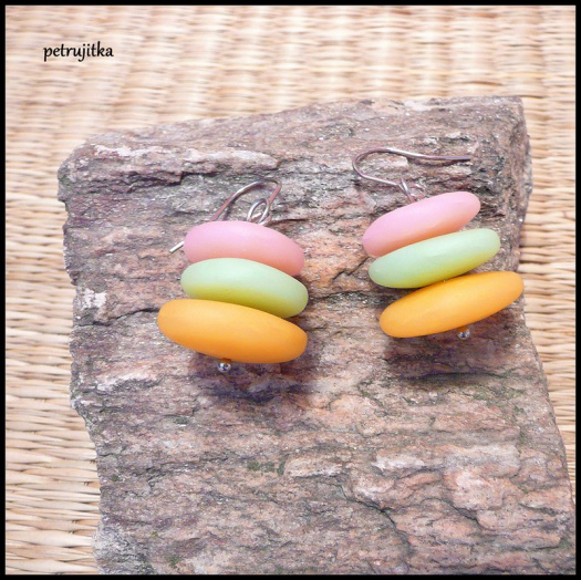 Originální náušnice z polymerové hmoty. Barva je růžová, zelená a