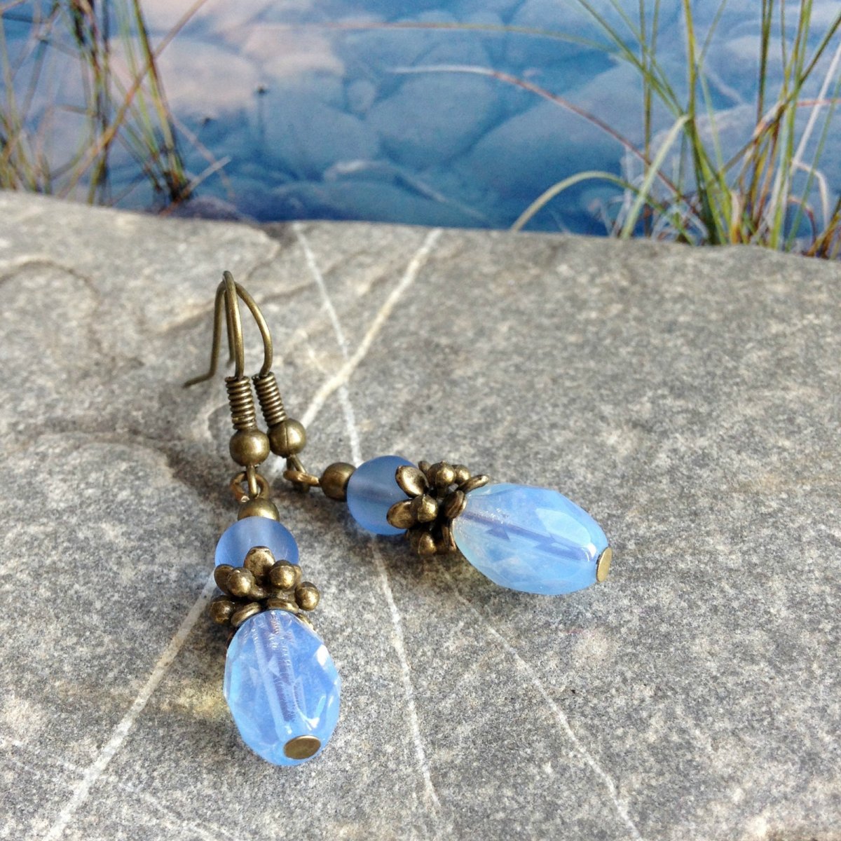 Náušnice ze světle modrých skleněných korálků a mosazných komponentů. Délka od háčku 2,5 cm, gumové zarážky