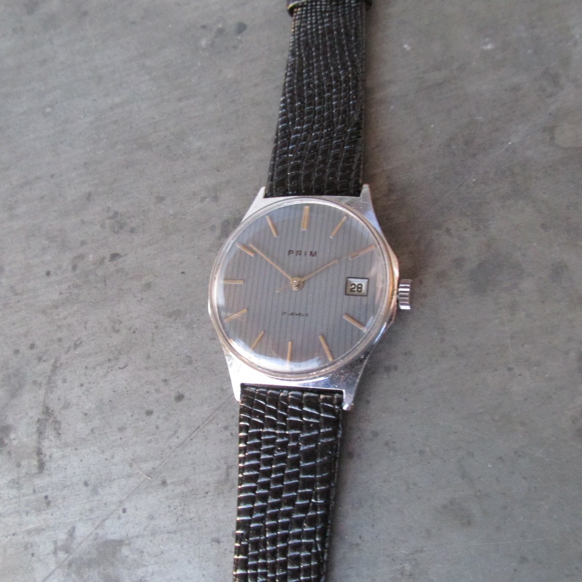 Elegantní mechanické náramkové retro hodinky Prim "PYŽAMO" s datumem, made in Czechoslovakia.