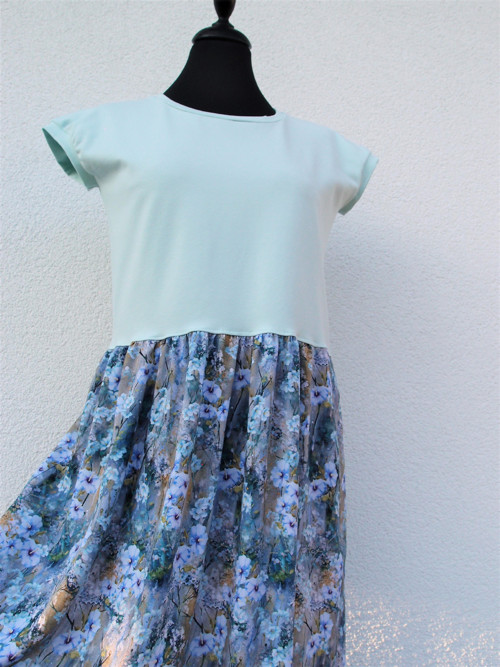 Krásné letní šaty s motivy květů lnu, či svlačce. Horní díl je z úpletu bavlna a elastan v mintové barvě a spodní díl je z velmi jemné a lehoučké viskózy. Na levém boku je rozparek pro pohodlný krok. V pase jsou šaty lehce nabírané. Mnohé skryjí a jsou díky svému střihu a vzdušnosti velmi jemné a podtrhnou vaši ženskost.