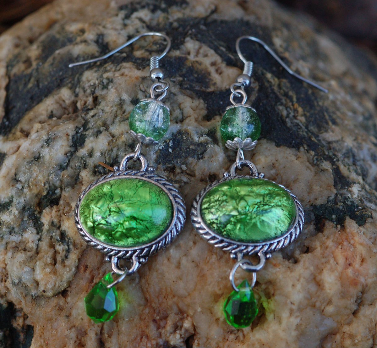 kovové komponenty, ručně mačkaná originální skla od skláře z Jizerských hor 18x13 mm, broušené skleněné kapky, praskačky, délka bez háčků 5 cm.