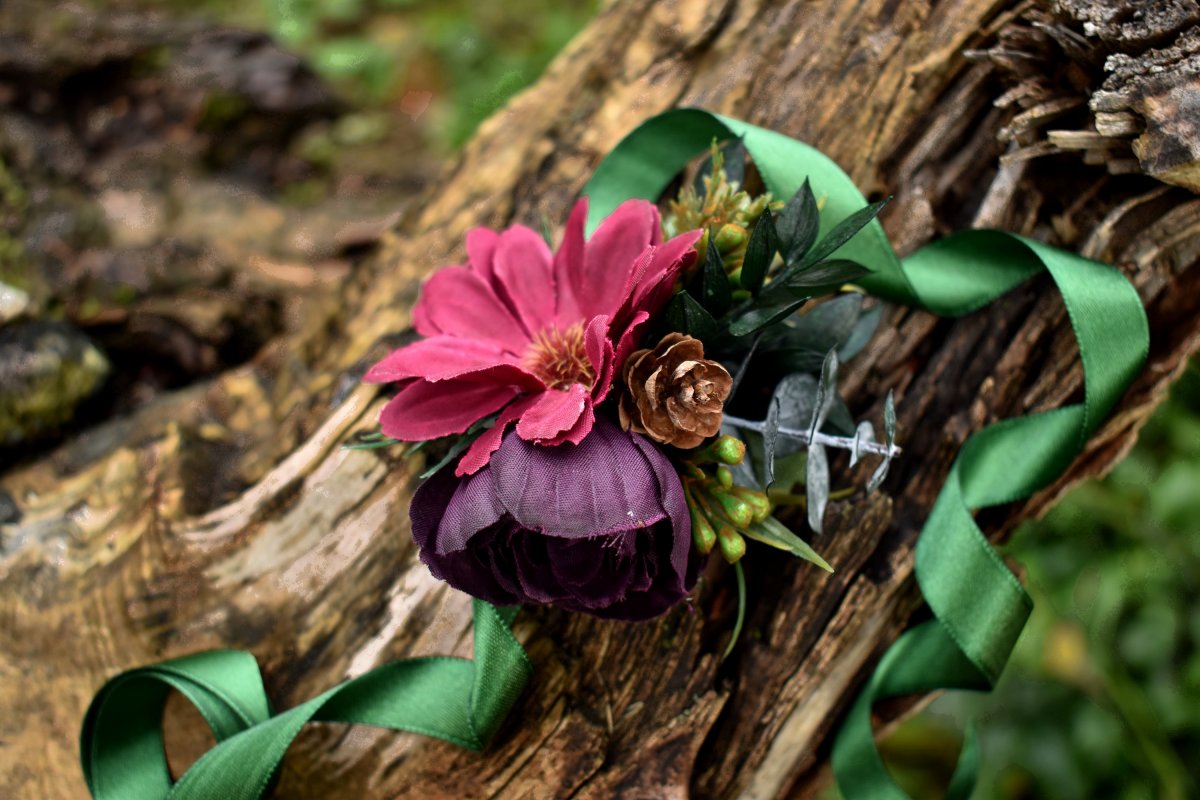 Krásný, romantický ale výrazný náramek z kytiček ve vínových barvách s šiškou, eukalyptem a lístečky, který si můžete vzít kdykoli, kdy se budete chtít cítit jako víla. Fantazii se meze nekladou!