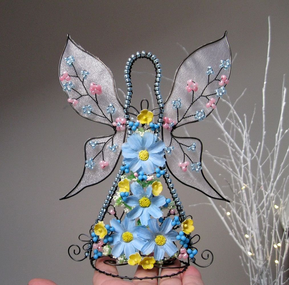 Nebo ji můžeme nazývat andělem. Tento je posetý hlavně modrými kvítky. Tělo a křidélka jsou vytvarována z žíhaného drátu, látkových květů a korálků.