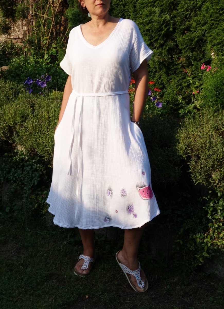 Letní šaty s prodyšného mušelínu.... lehoučké. Bílé lehce projmuté, širší sukýnka, přinechaný rukáv, výstřih do V, ale na přání může být i kulatý nebo lodičkový, nechybí praktické kapsy a tenký pásek. Barvy možnost i v černé, červené, kari žluté, béžové....