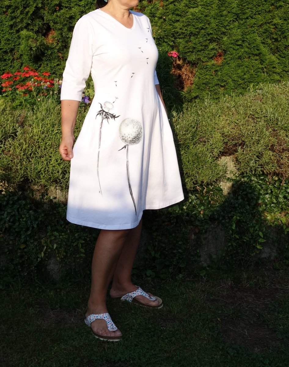 Elegantní a pohodlné úpletové šaty. Přední díl s malůvkou pampelišek. Střih lehce projmutý ,širší sukýnka a nechybí ani ležerní kapsy (můžou být i bez kapes). Na obrázku výstřih do V na přání zákaznice pokud chcete kulatý nebo lodičkový napište si. Pod bílé šaty nosíme tělové spodní prádlo.