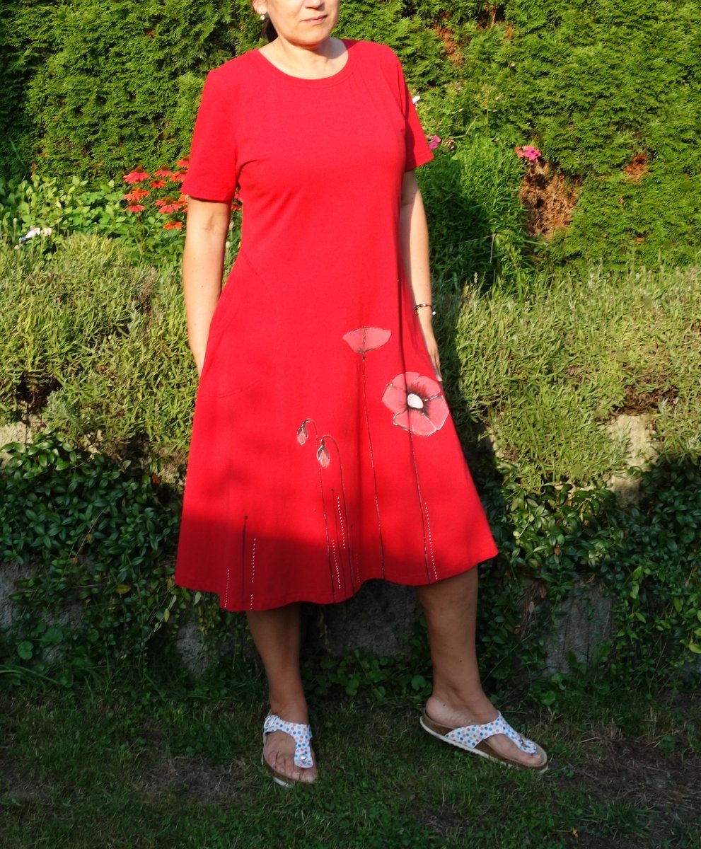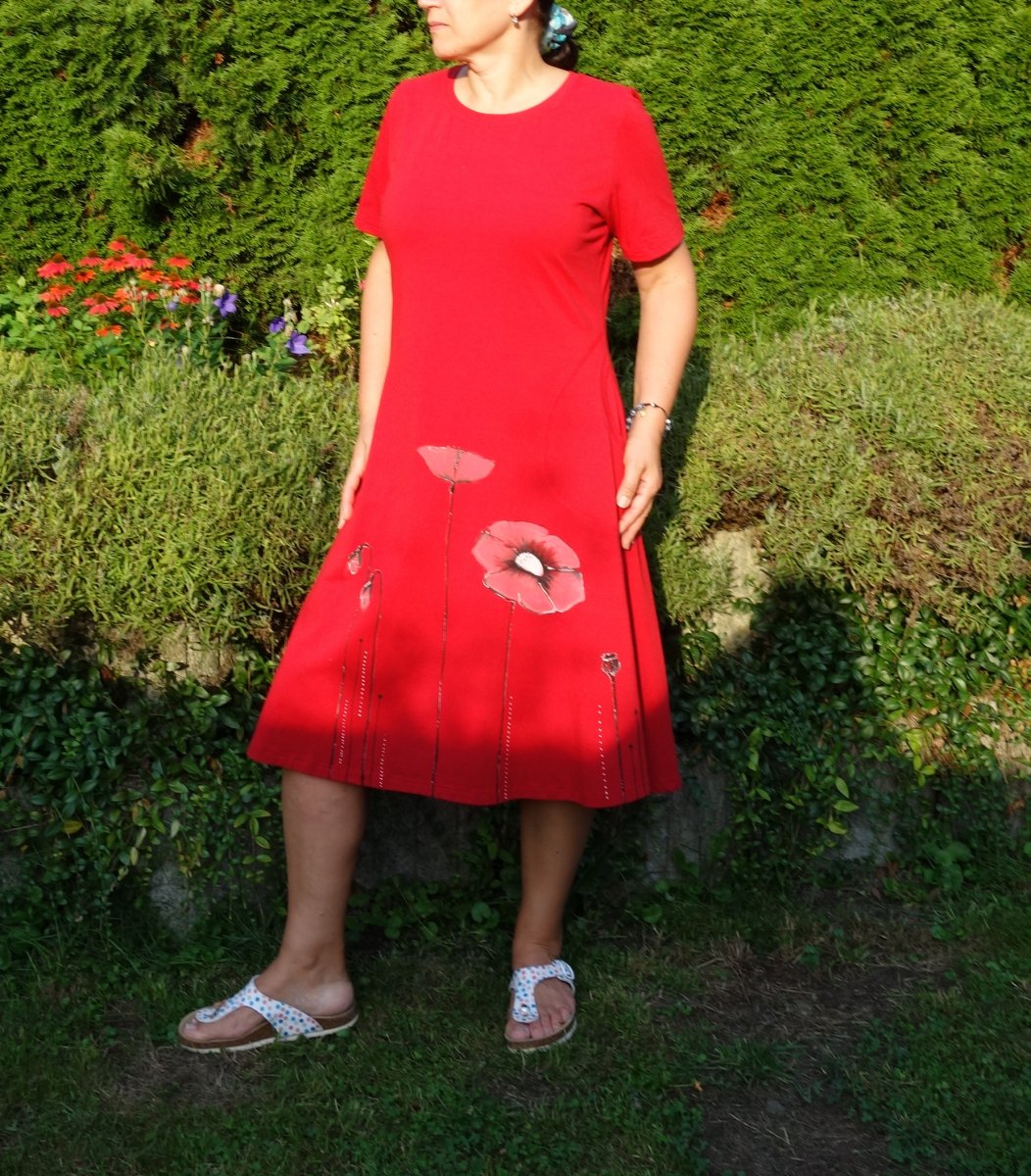 Elegantní a pohodlné úpletové šaty. Přední díl s malůvkou máků. Střih lehce projmutý ,širší sukýnka a nechybí ani ležerní kapsy (můžou být i bez kapes). Na obrázku výstřih kulatý na přání zákaznice - pokud chcete do V nebo lodičkový napište si.