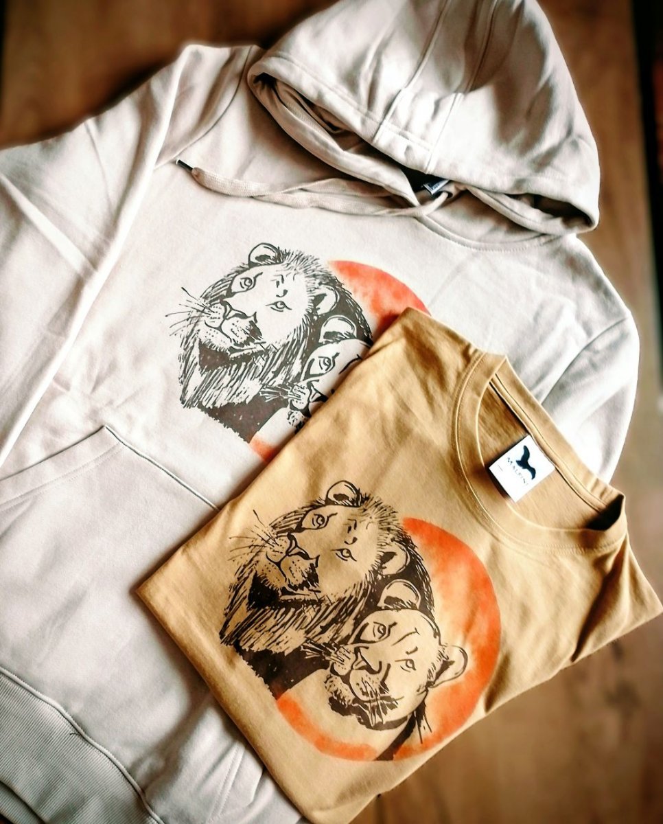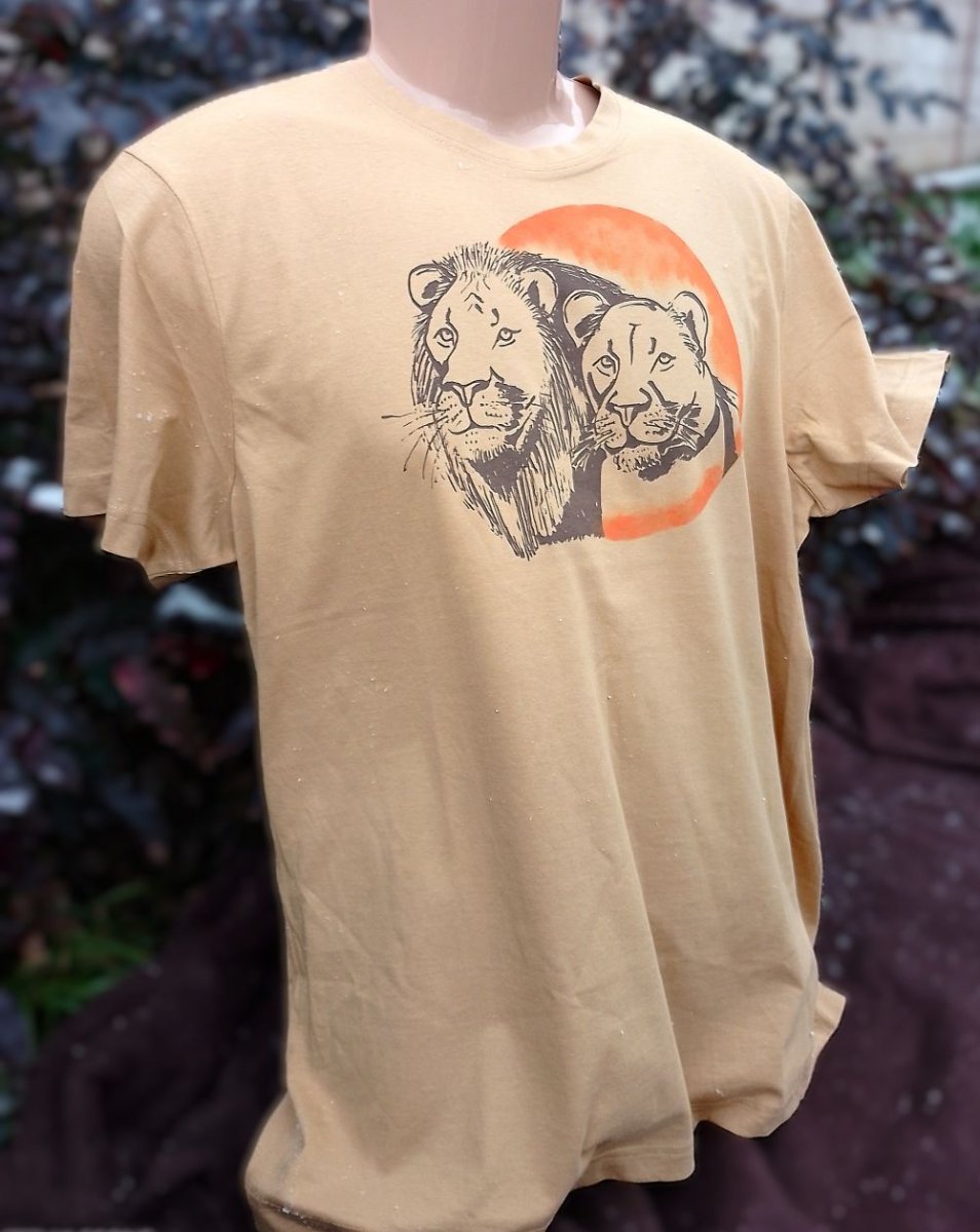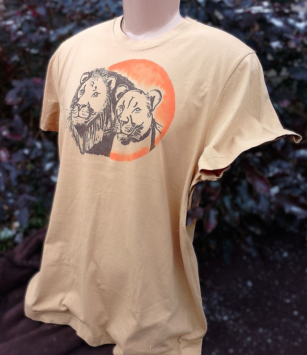 Bavlněné tričko v hřejivých barvách afrického písku s originálním ručním potiskem krále zvířat lva a lvice.