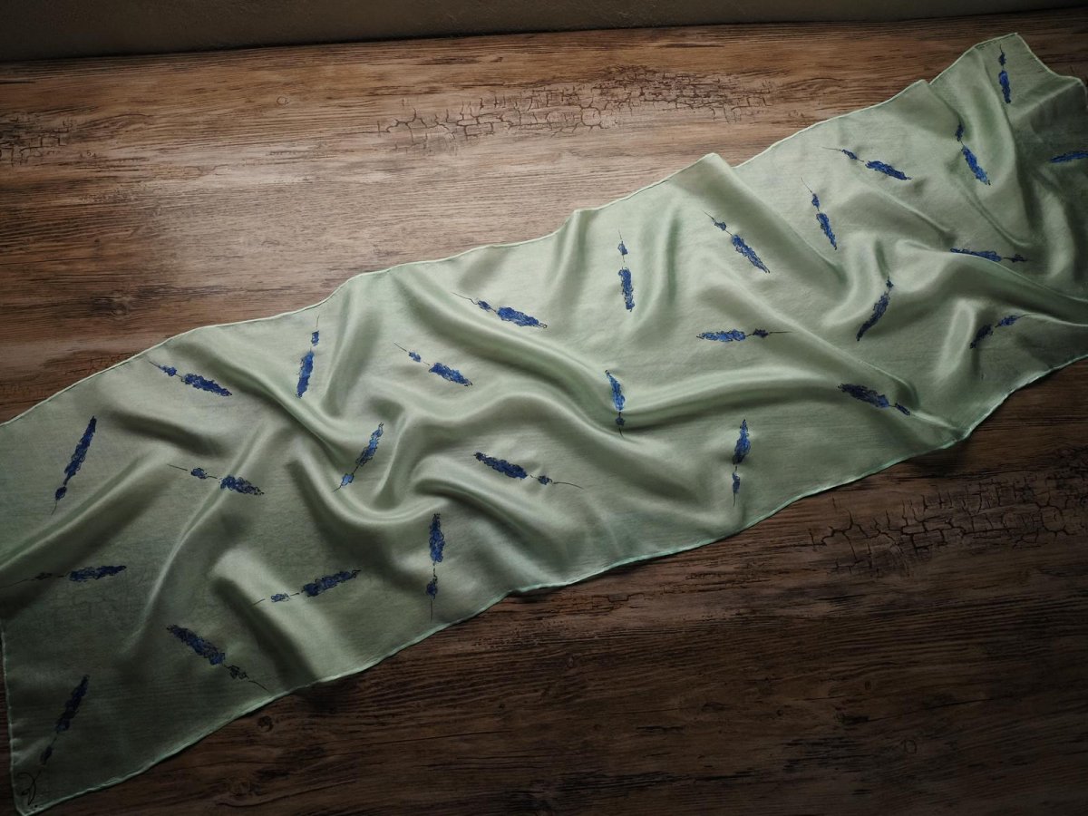 Ručně malovaný šál z přírodního hedvábí (pongé 5). Použití kvalitních barev a tepelné fixace zaručuje dlouhodobou odolnost při opakovaném praní. Snadno se žehlí.