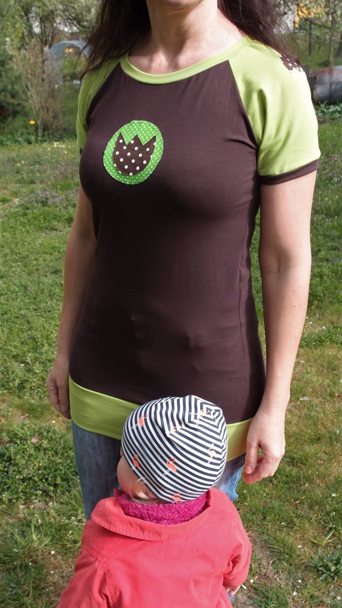 Krásná kombinace čokoládově hnědé barvy a limetkově zelené. Přišité jsou aplikace tulipánů na PD na levém rukávu.