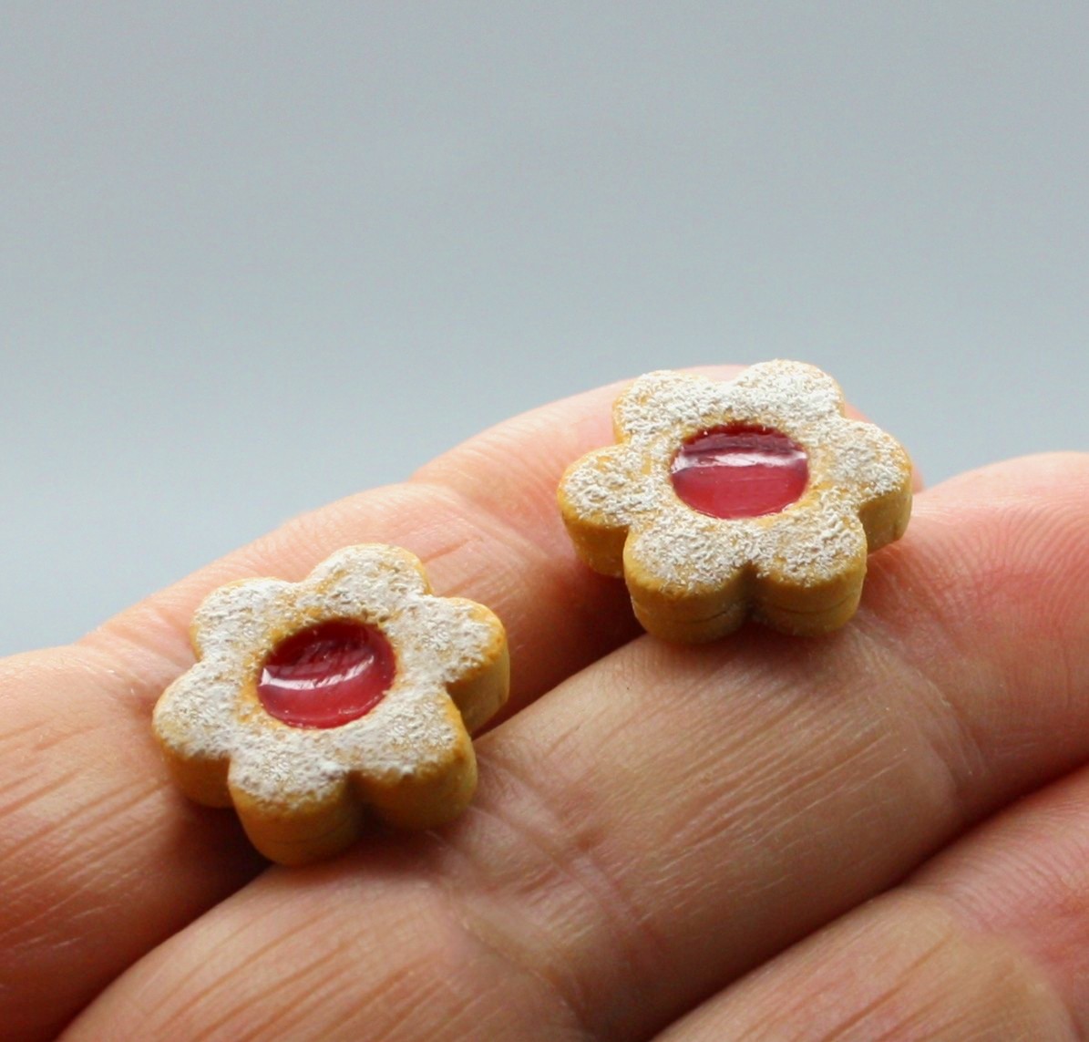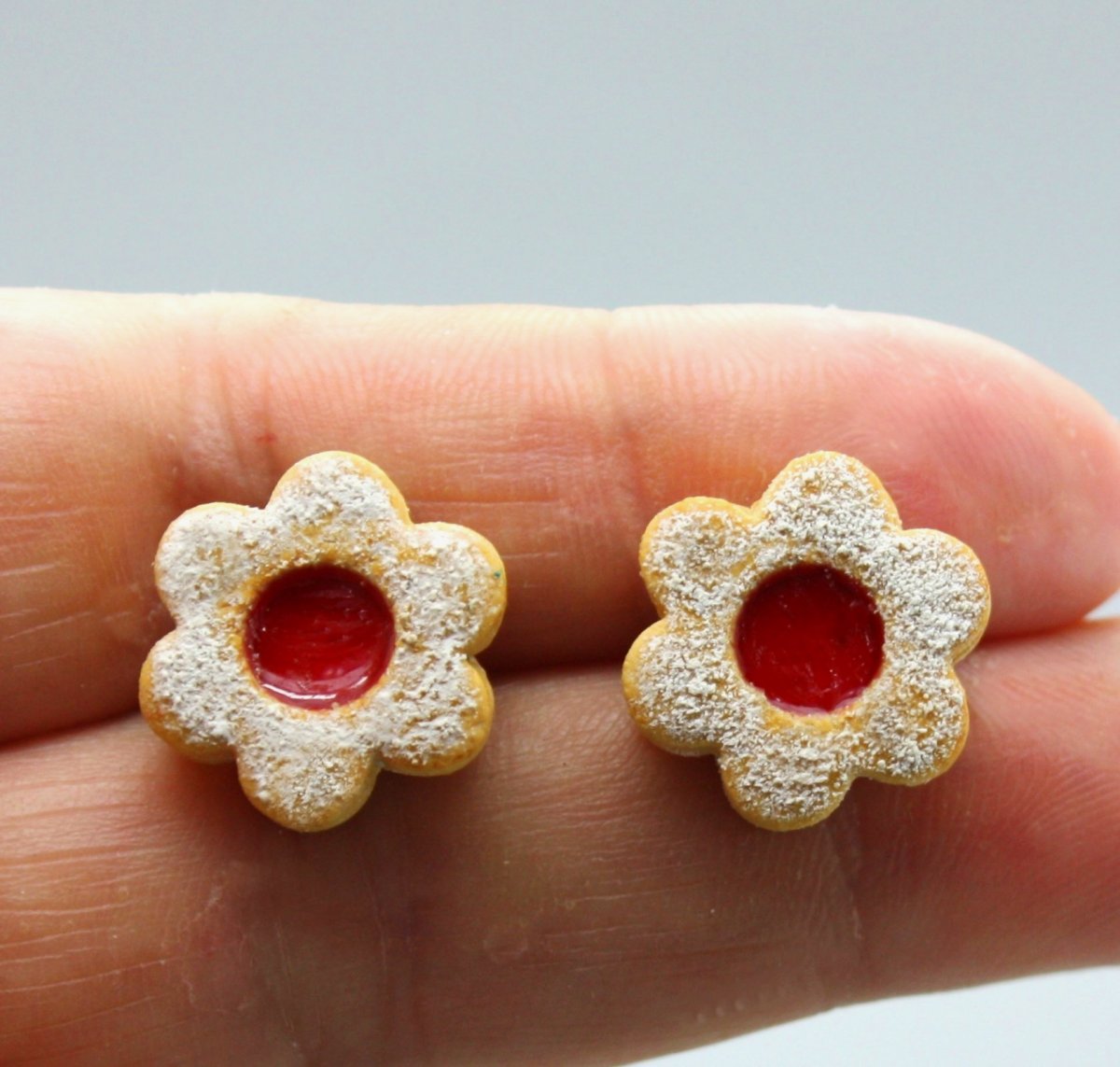 náušnice z polymerové hmoty v podobě lineckého cukroví, na bižuterních puzetkách, průměr 1,5 cm