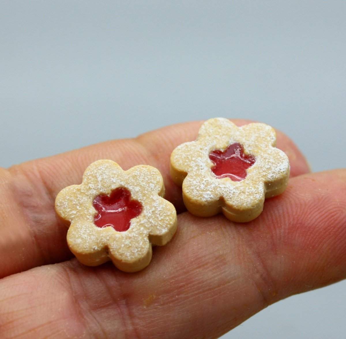 náušnice z polymerové hmoty v podobě lineckého cukroví, na bižuterních puzetkách, průměr 1,5 cm