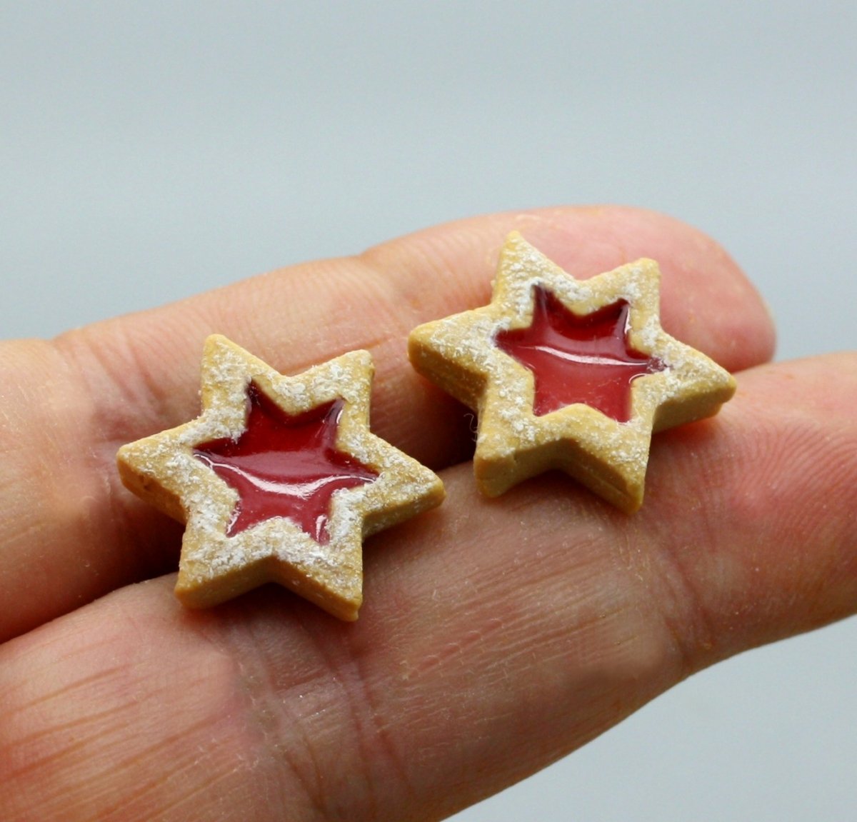 náušnice z polymerové hmoty v podobě lineckého cukroví,  na bižuterních puzetkách,  průměr 1,5 cm