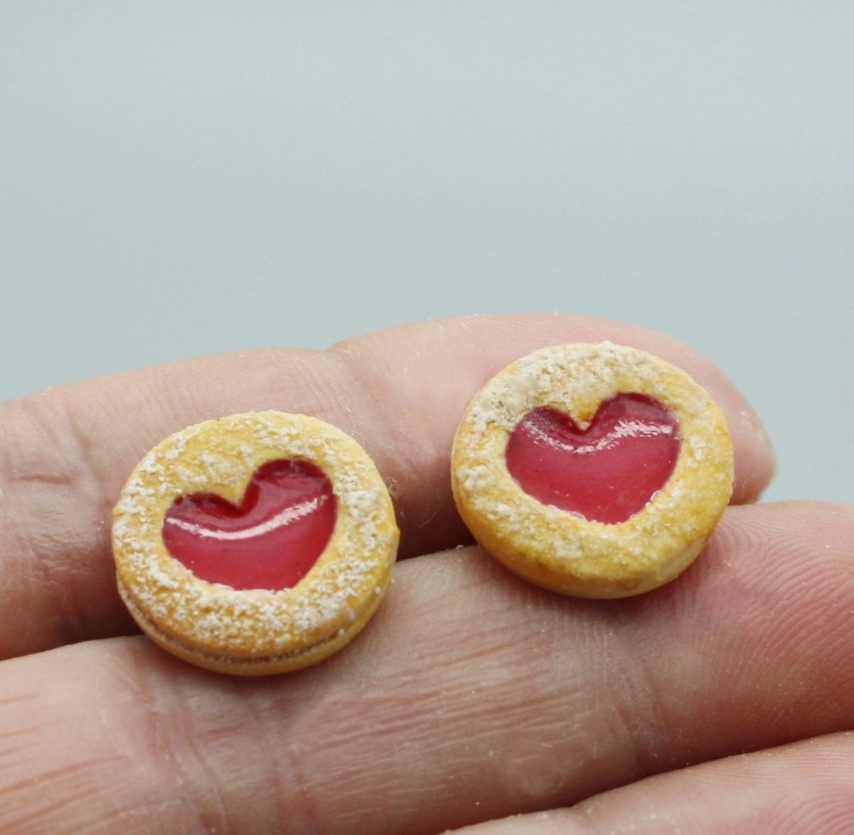 náušnice z polymerové hmoty v podobě lineckého cukroví, na bižuterních puzetkách, průměr 1,5 cm