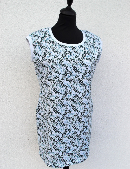 Dámské šaty, tunika z příjemného úpletu - bavlna + elastan. Materiál je pružný. Šaty lze nosit k legínám, dlouhým i 3/4, ale také k džínám, nebo prostě jen jako šaty či delší tuniku. Pěkný kousek na léto bez rukávů.