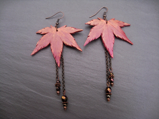 Náušnice tvořené lístky javoru z polymerové hmoty Fimo a Premo, doplněné o broušené skleněné korálky na řetízcích. Přední strana lístků je otiskem skutečného listu, patinovaná metalickým pudrem a po vytvrzení pudr zafixován lakem. Zadní strana lehce texturovaná, bez pudru a laku. Rozměr listu v nejširších místech cca 4 x 5 cm. Délka vč. afroháčku cca 10 cm. Komponenty měděné barvy.