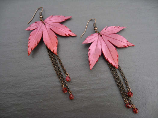 Náušnice tvořené lístky červeného javoru z polymerové hmoty Fimo a Premo, doplněné o broušené skleněné korálky na řetízcích. Přední strana lístků je otiskem skutečného listu, patinovaná metalickým pudrem a po vytvrzení pudr zafixován lesklým lakem (listy se skutečně lesknou!). Zadní strana lehce texturovaná, bez pudru a laku. Rozměr listu v nejširších místech cca 3 x 5 cm. Délka vč. afroháčku cca 9,5 cm. Komponenty měděné barvy.