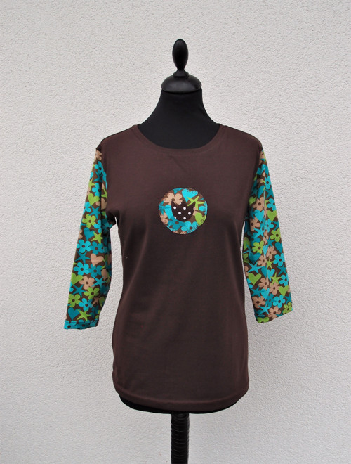 Dámské tričko hnědé barvy s barevnými rukávy v odstínech zelené a modré. Na předním dílu je aplikace z téže látky a tulipánu - ozdobně prošité.