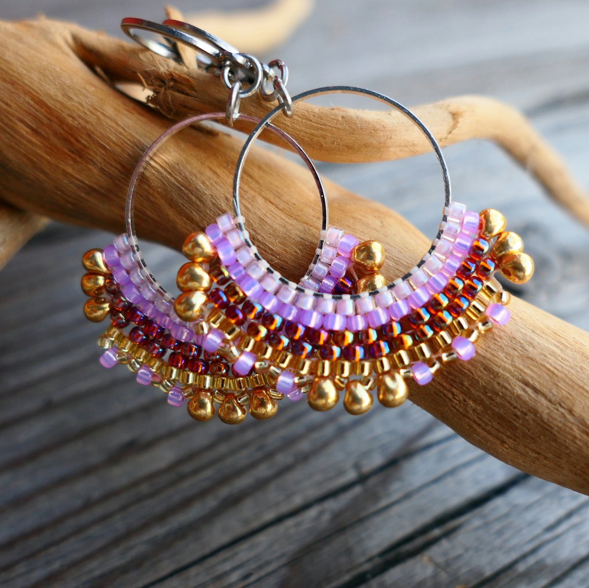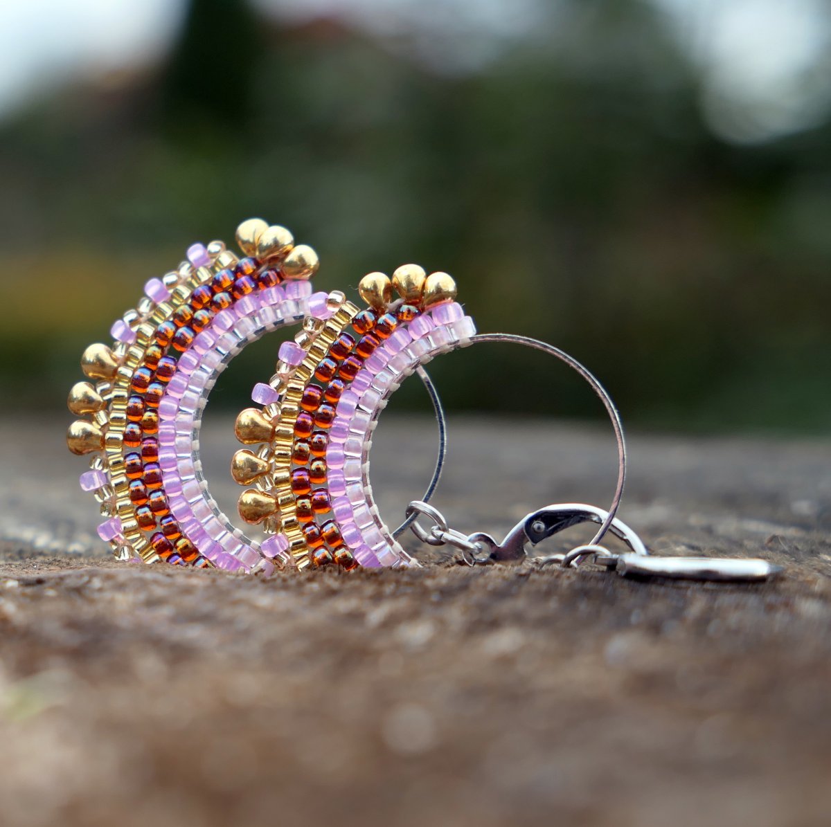 Ušito z japonského rokailu Toho a Miyuki v barvě růžové, zlaté a červené s AB listrem. Doplněno korálky Miyuki Drop.