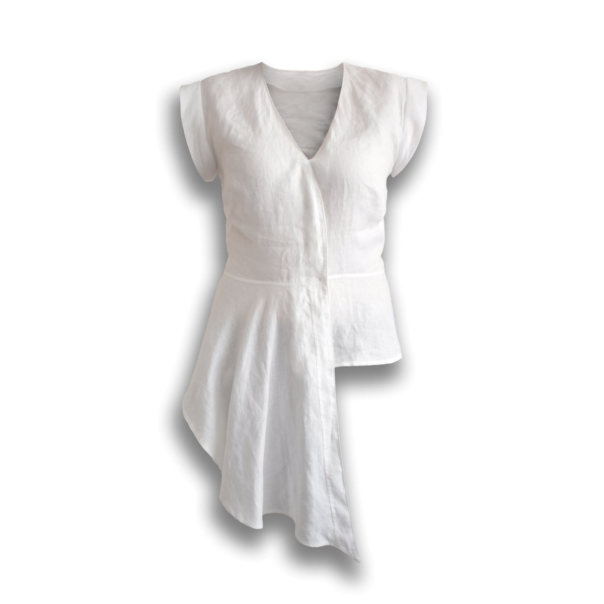 Halenka z jemného lněného plátna s asymetricky tvarovaným dolním krajem. Přední díl je zapínaný na patentky a tvarovaný francouzskými záševky. ZD i PD díl jsou členěné švem v linii pasu. Rukávy jsou krátké. Silueta halenky je vypasovaná, díly pod pasem jsou mírně rozšířené.
