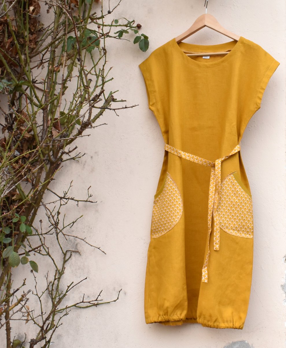 Šaty mají jednoduchý střih s kapsami, lze nosit volně nebo s páskem. Pásek lze nosit variabilně vpředu nebo stáhnout vzadu, v dolním lemu je šňůrka na případné stažení.