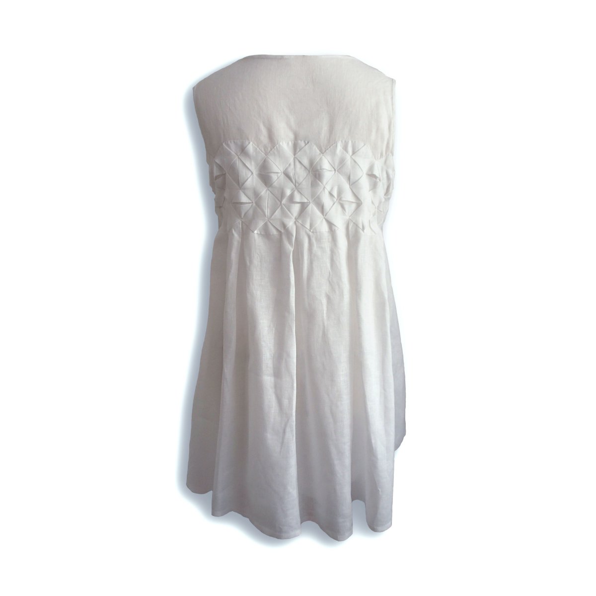 Lněné šaty empírového střihu v ivory barvě zdobené textilní technikou origami, která volně přechází do sukňové části šatů. Spodní šaty jsou tvarované záševky a jejich dolní sukně je rozšířená.