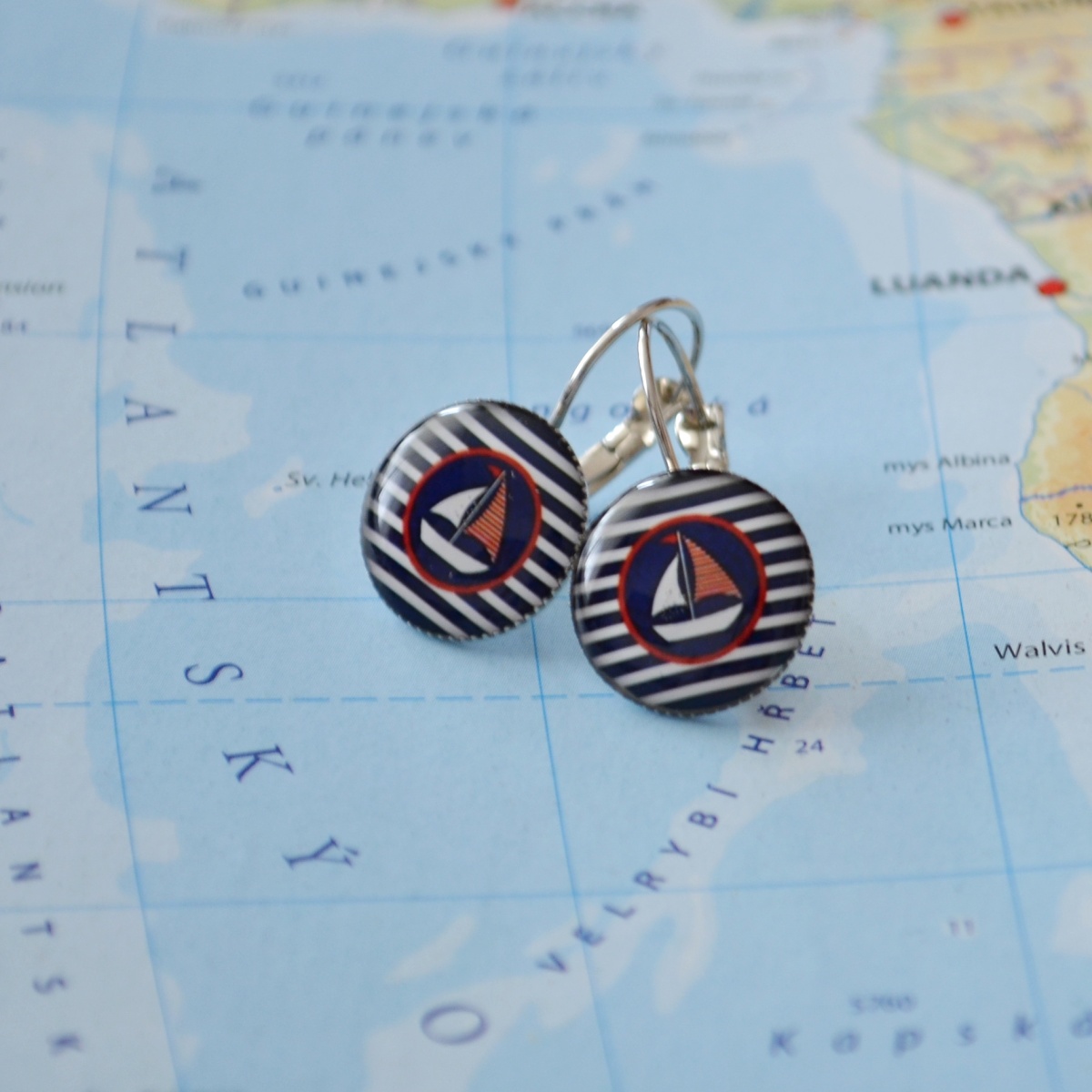 Modrobíločervené náušnice s námořnickým motivem, lodičkou a modroobílými pruhy.