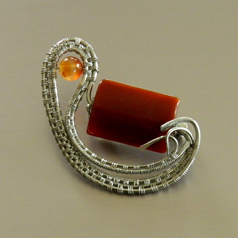 Elegantní brož s korálky karneolu. Je vyrobená náročnou technikou wire wrapping z nerezového drátu. Velikost 5 x 3 cm. Brožový můstek se zajištěním.Nerezový drátek vyhovuje většině alergiků (podobně jako chirurgický drát - osteofix) a díky své tvrdosti odolá i běžnému dennímu zacházení. Šperky vyrobené z oceli nekorodují, dají se omývat ve vodě a vystavovat povětrnostním vlivům.
