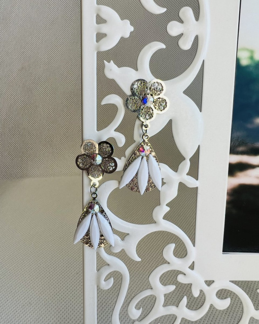 Nádherné dámské náušnice z crystal AB kamínků Swarovski a bílých kamínků. Náušničky mají napichovací zapínání ve tvaru kytičky a je z nerezové oceli.