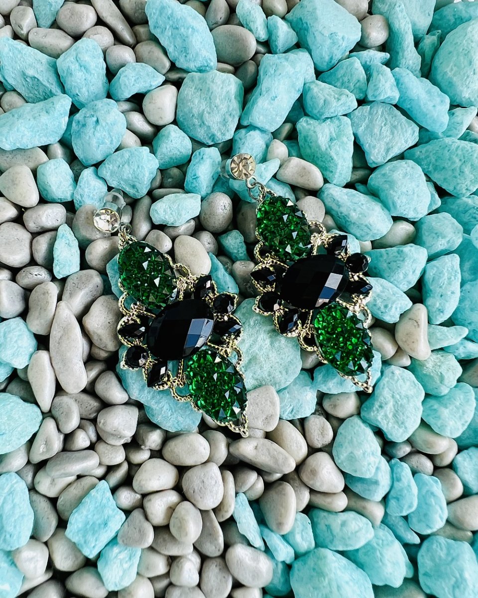 Nádherné dámské náušnice z různých černých a zelených kamínků. Náušničky mají napichovací zapínání v přední částí s crystal kamínkem.