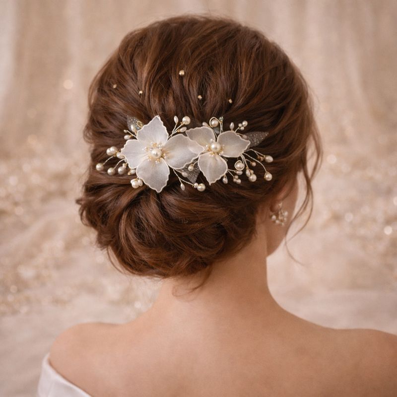 Tento luxusní svatební šperkový set je navržen tak, aby podtrhl přirozenou krásu nevěsty a harmonicky ladil se svatebními šaty. Náhrdelník zdobí jemný květinový motiv s perličkami a drobnými zlatavými akcenty, které vytvářejí romantický a zároveň elegantní vzhled. Set doplňují perličkové náušnice, které celý komplet vyrovnávají a působí nadčasově.