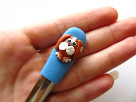 Ručně dělaná FIMO lžička s pejskem na modrém podkladu.