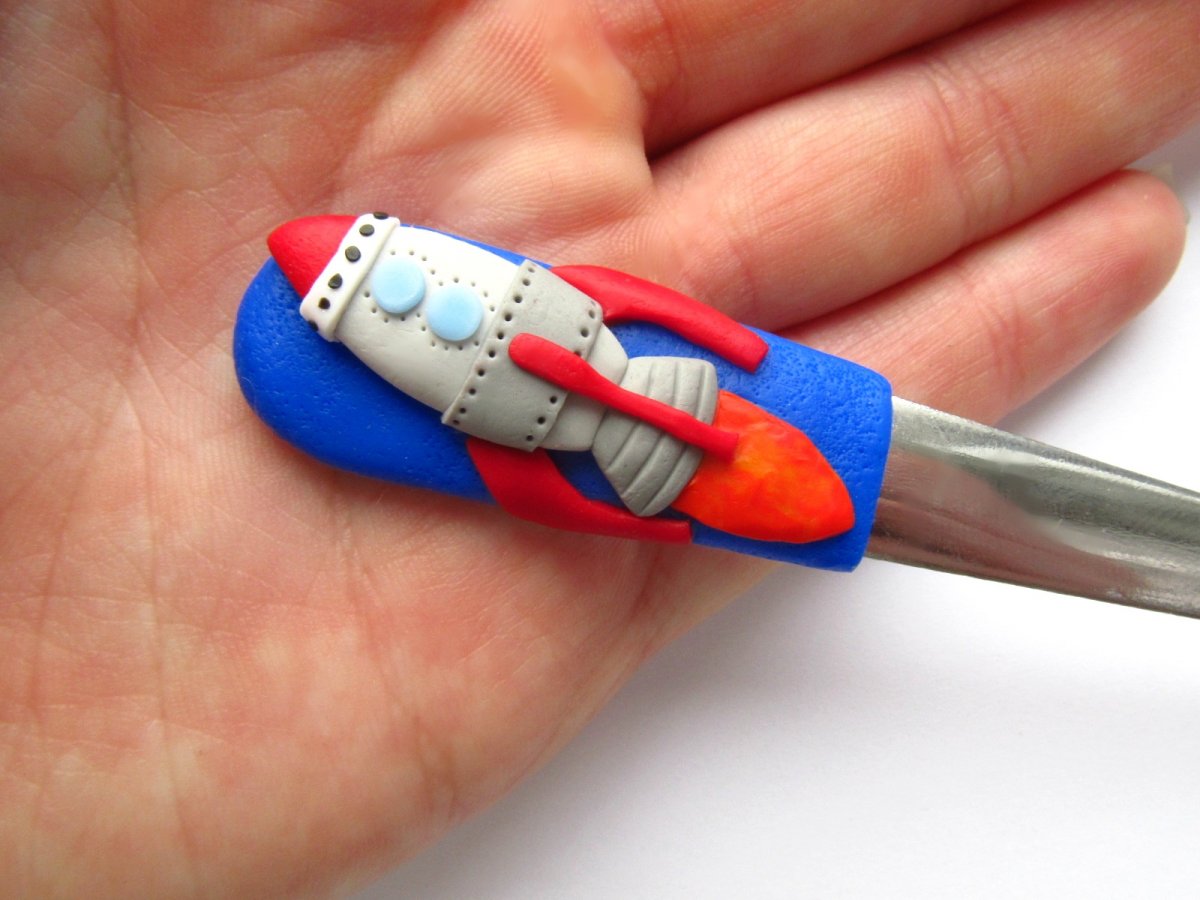 Ručně dělaná FIMO lžička s raketou pro kluky.
