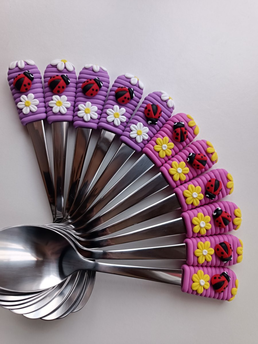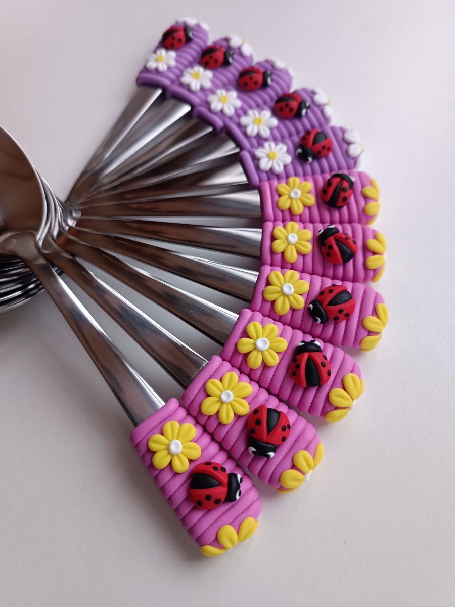 Nerez lžička 13,5 cm ozdobená fimo motivem. Možno vyrobit v jiné barevné kombinaci.